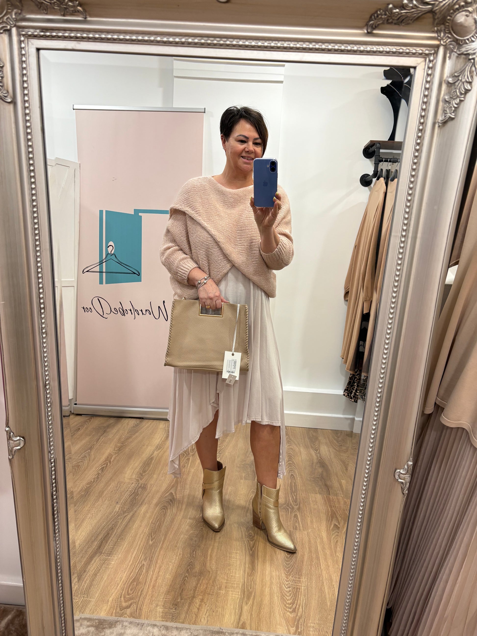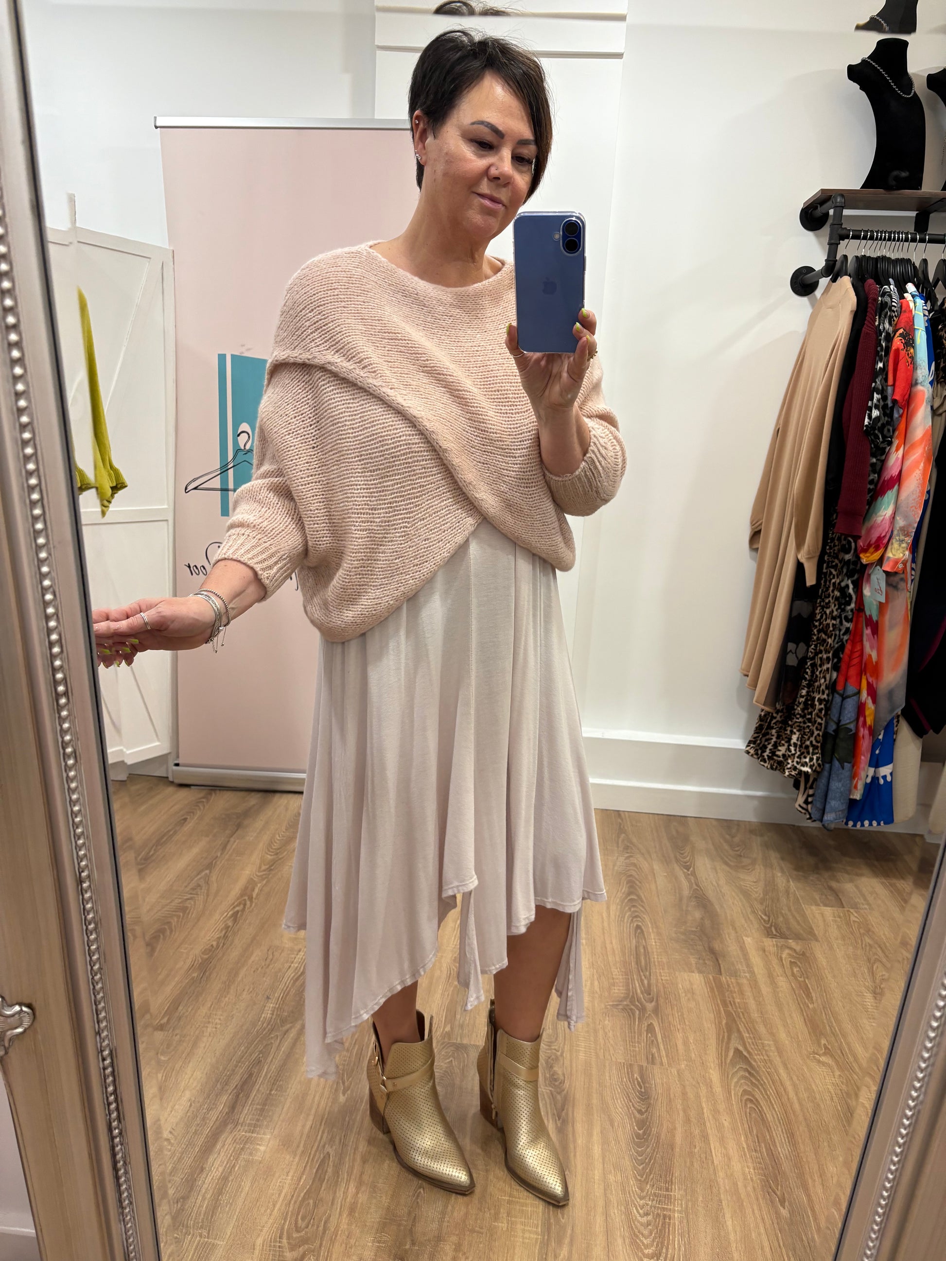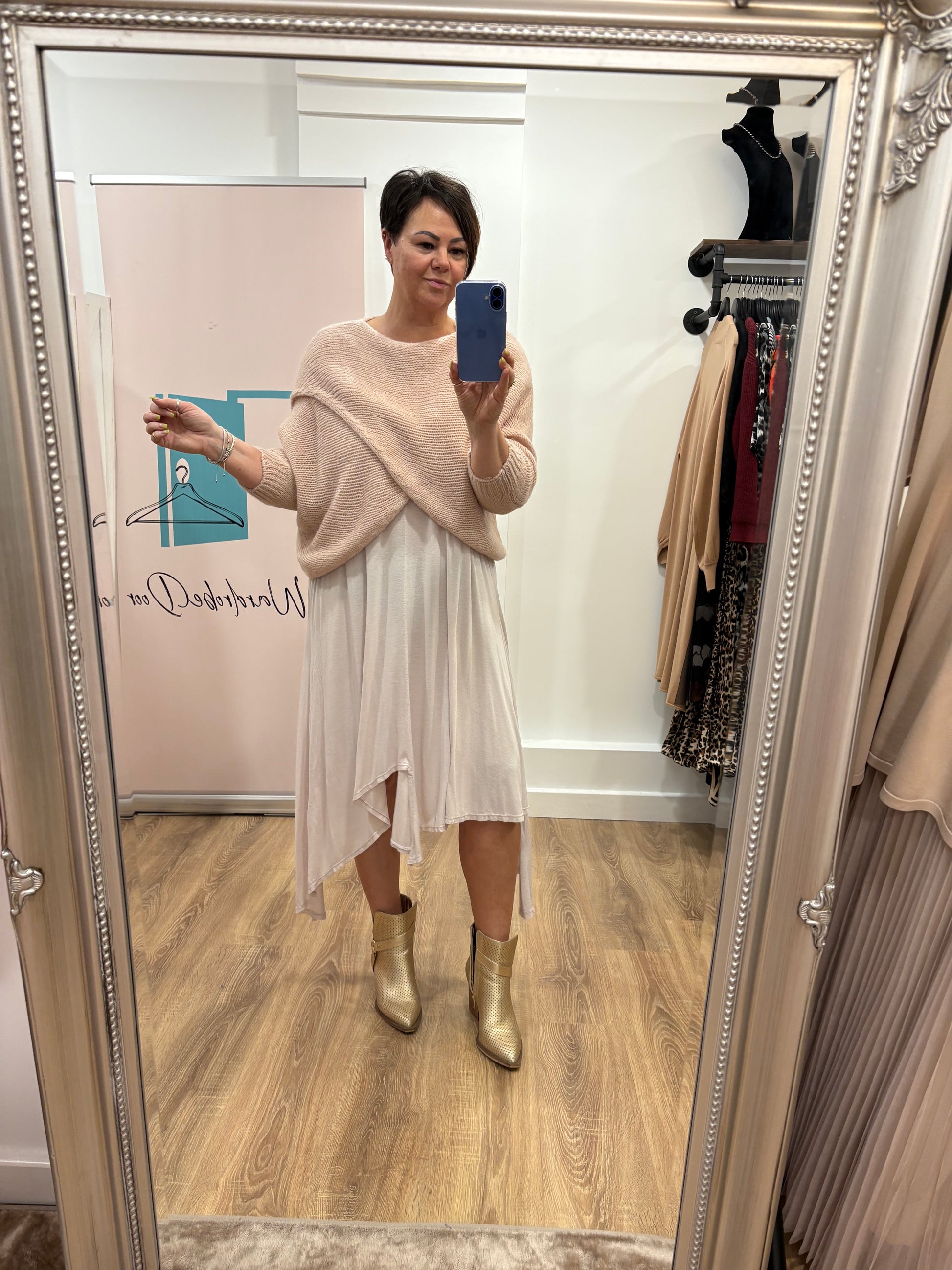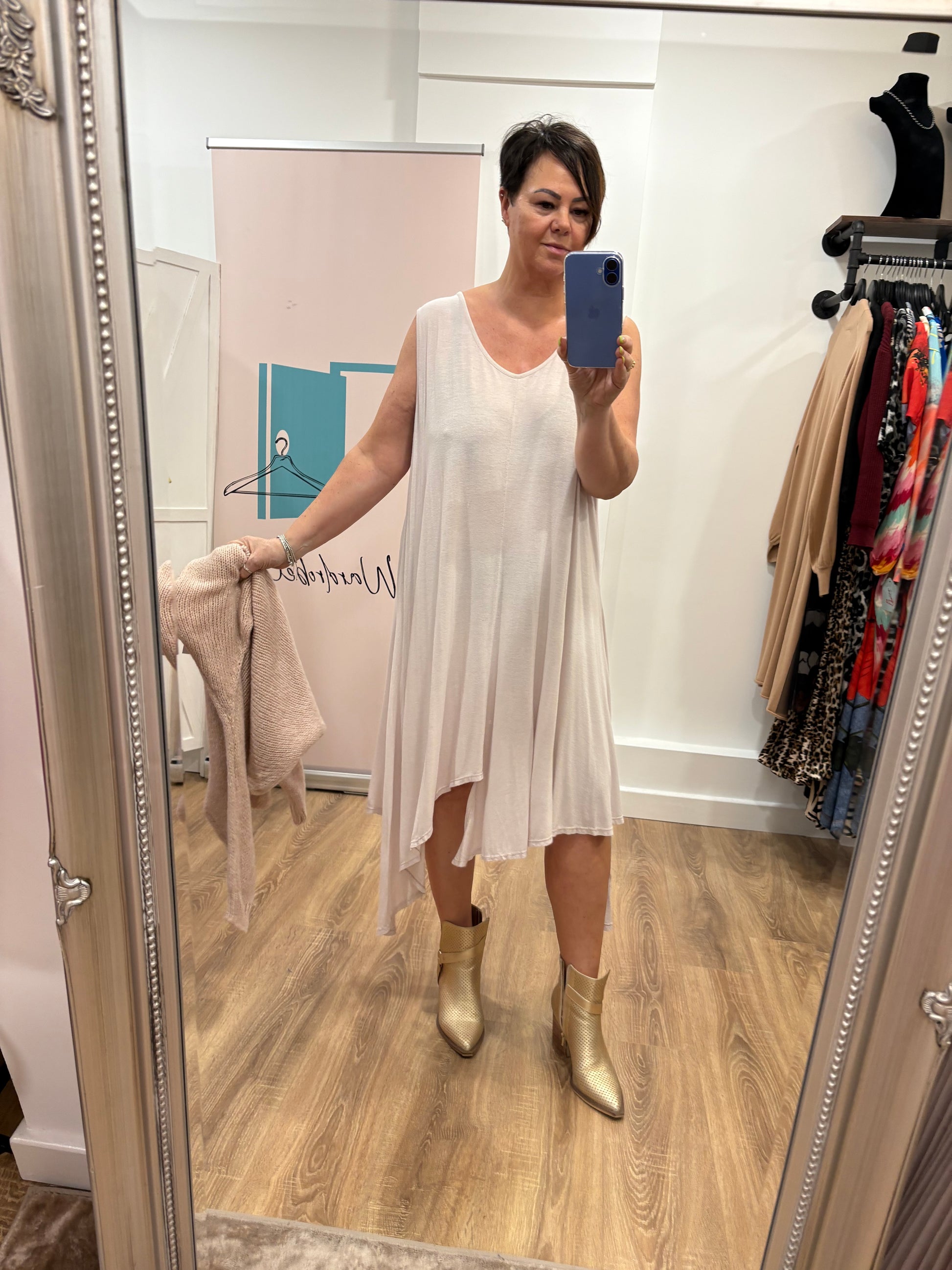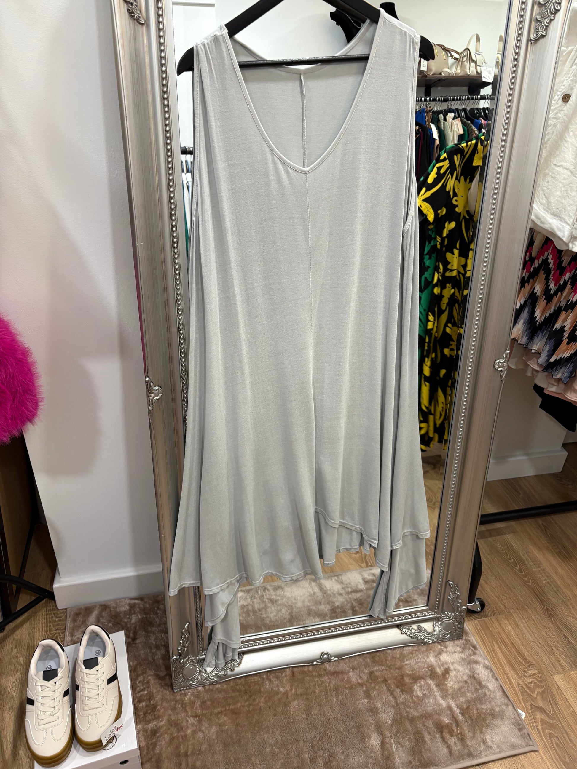 Jagged hem midaxi dress in lightweight stretch fabric, with no sleeves.