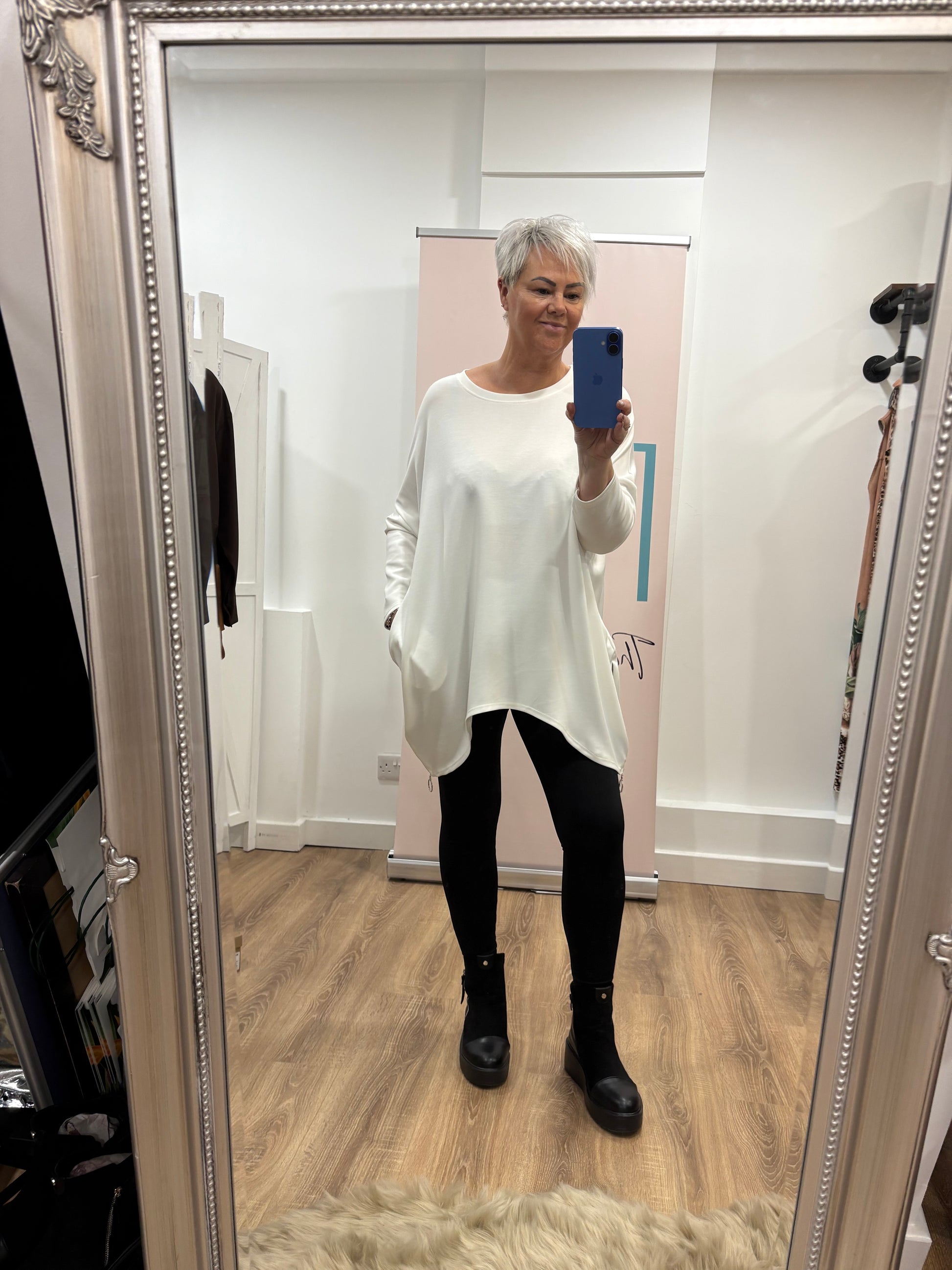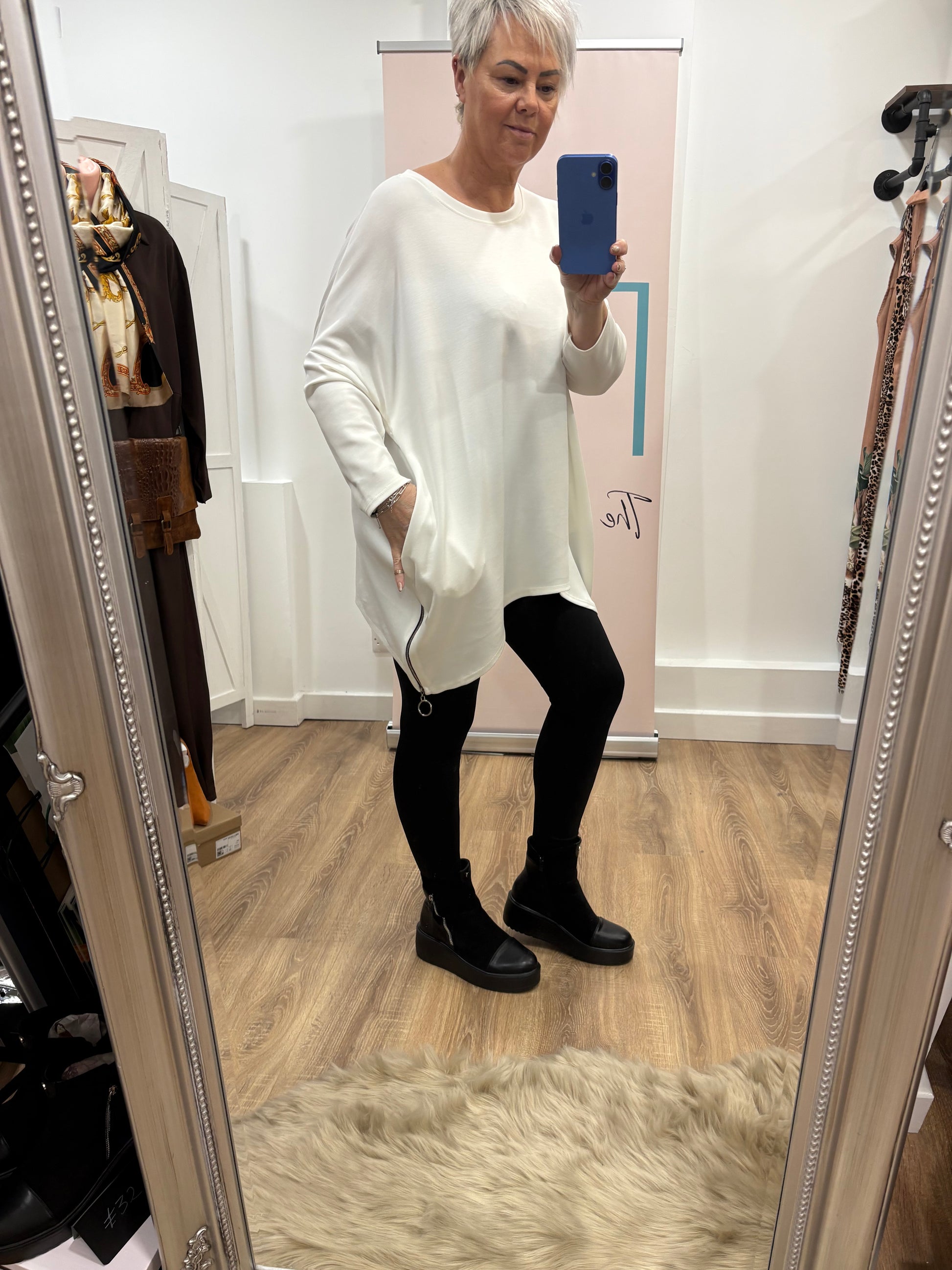 Longer at the sides with pockets and zips to the side detail.