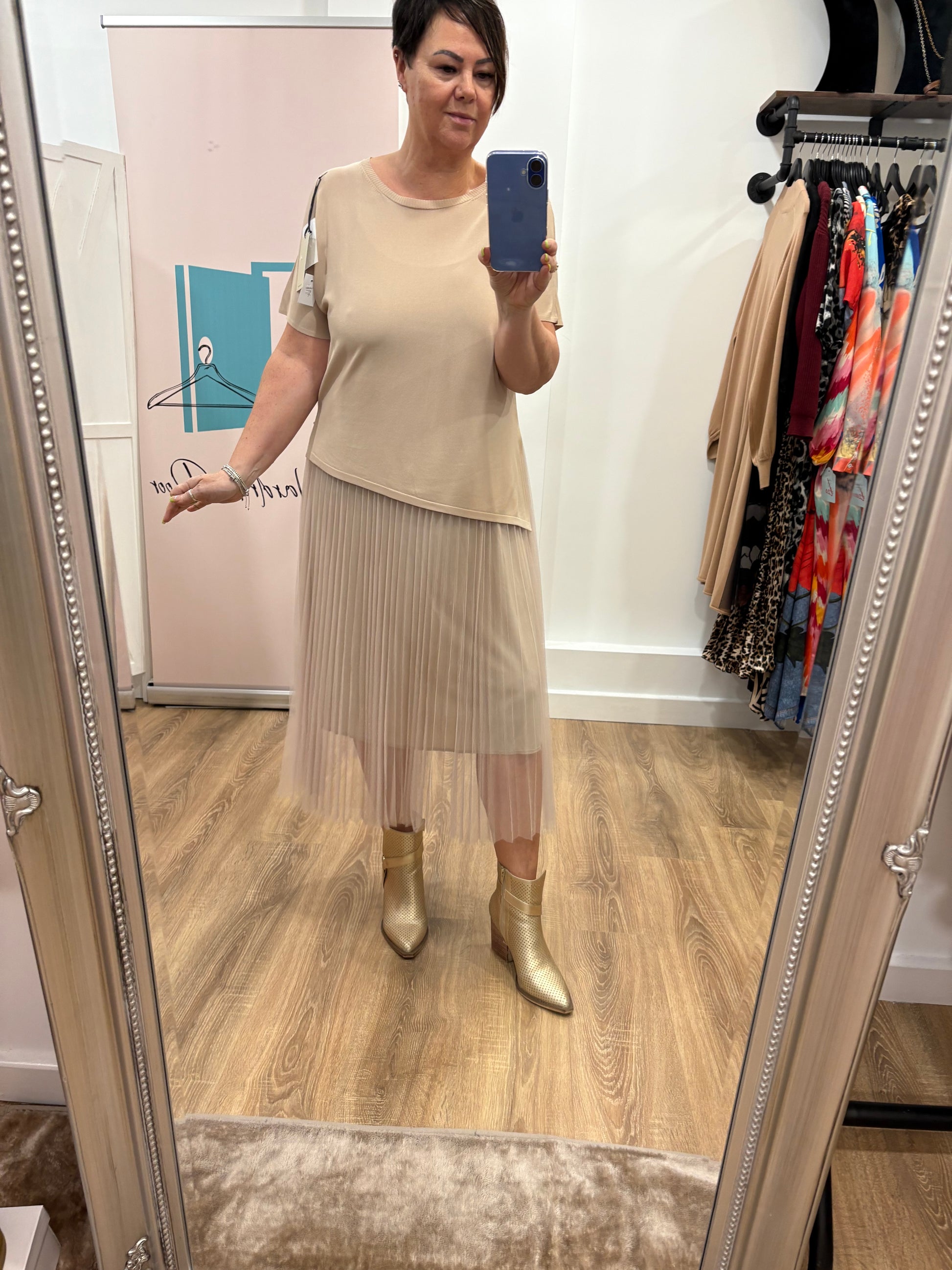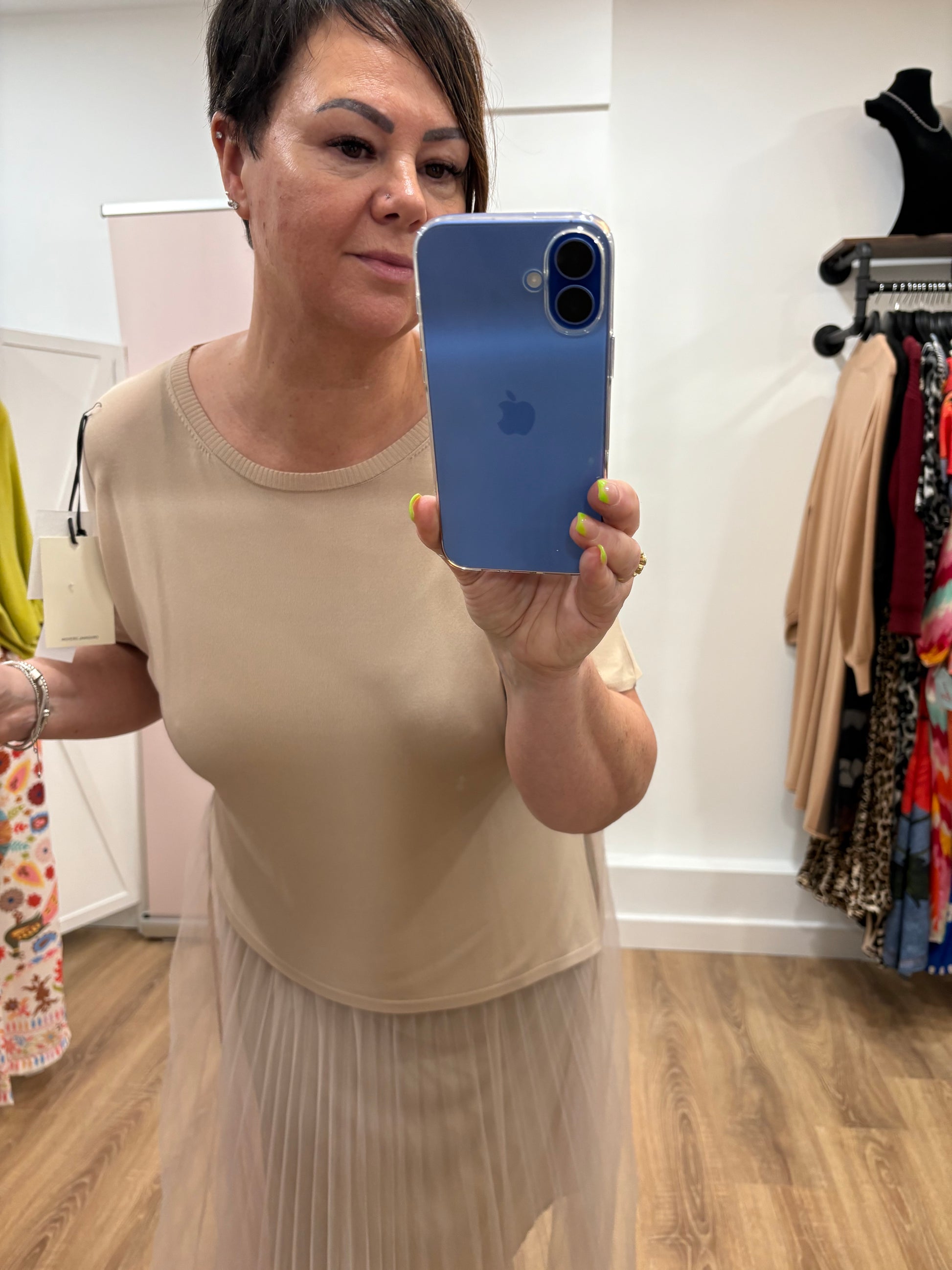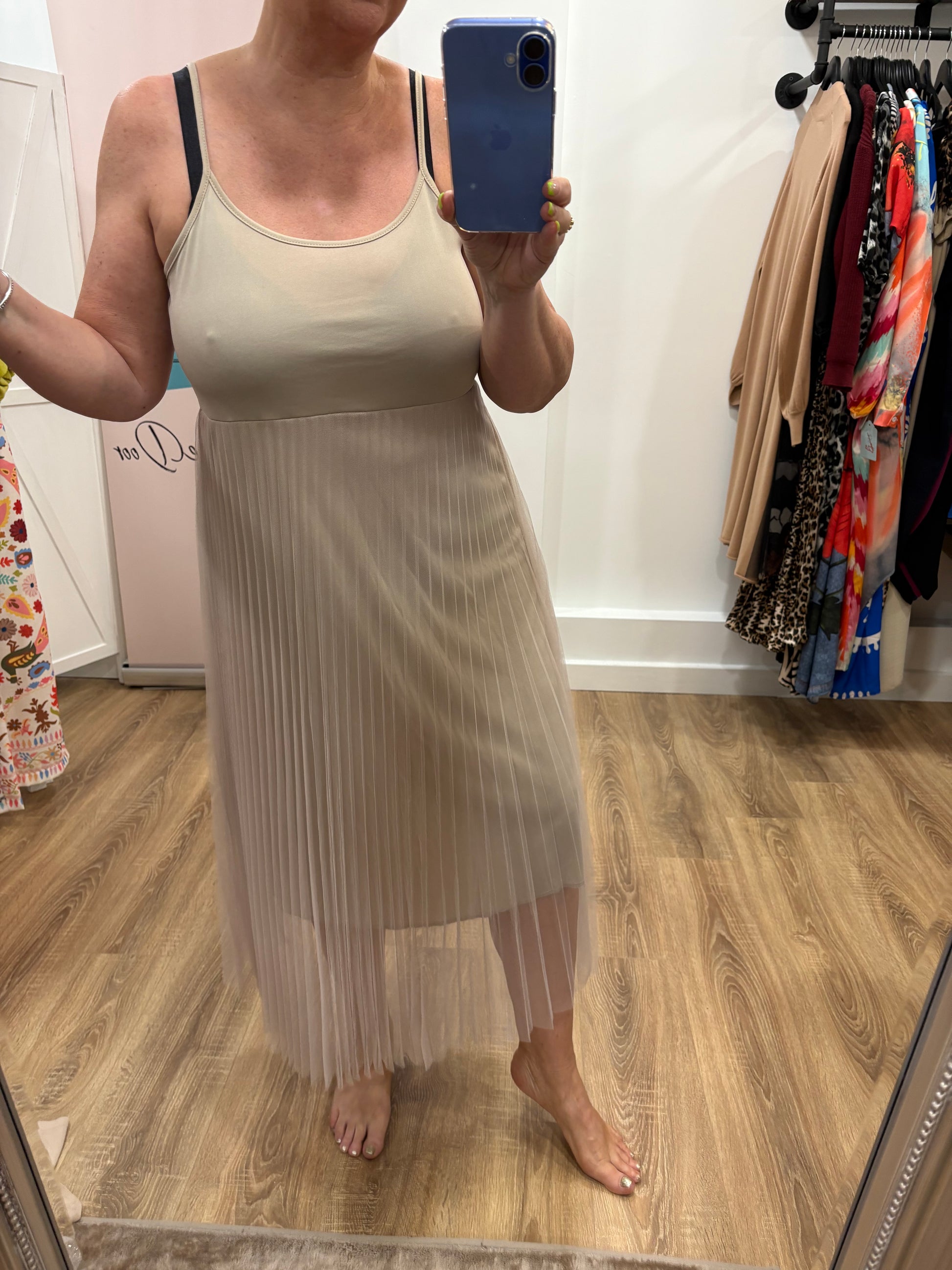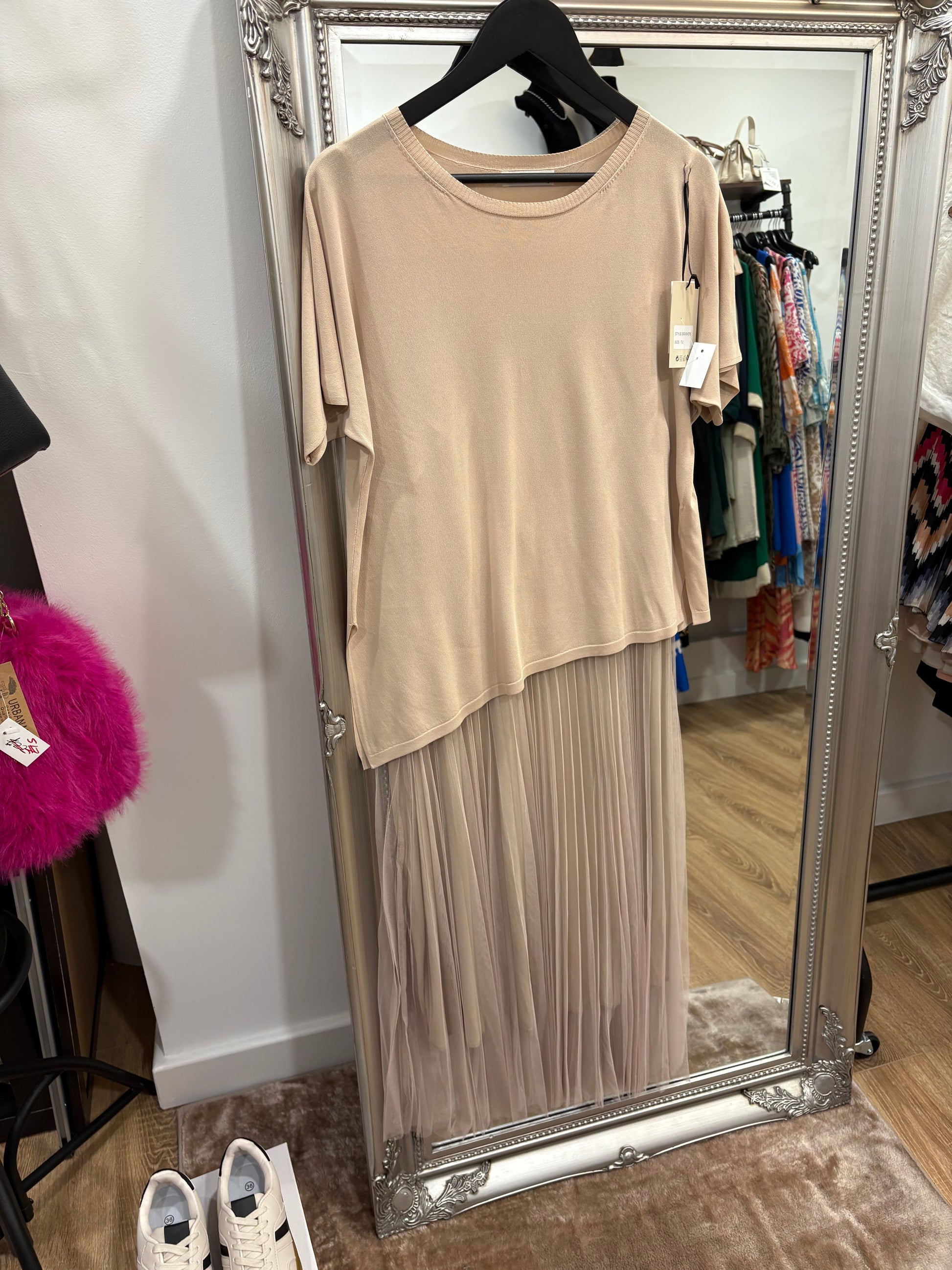 Short sleeve luxury t-shirt with slit sides (slightly asymmetric) and strappy dress with adjustable camisole straps and pleated jet overskirt.