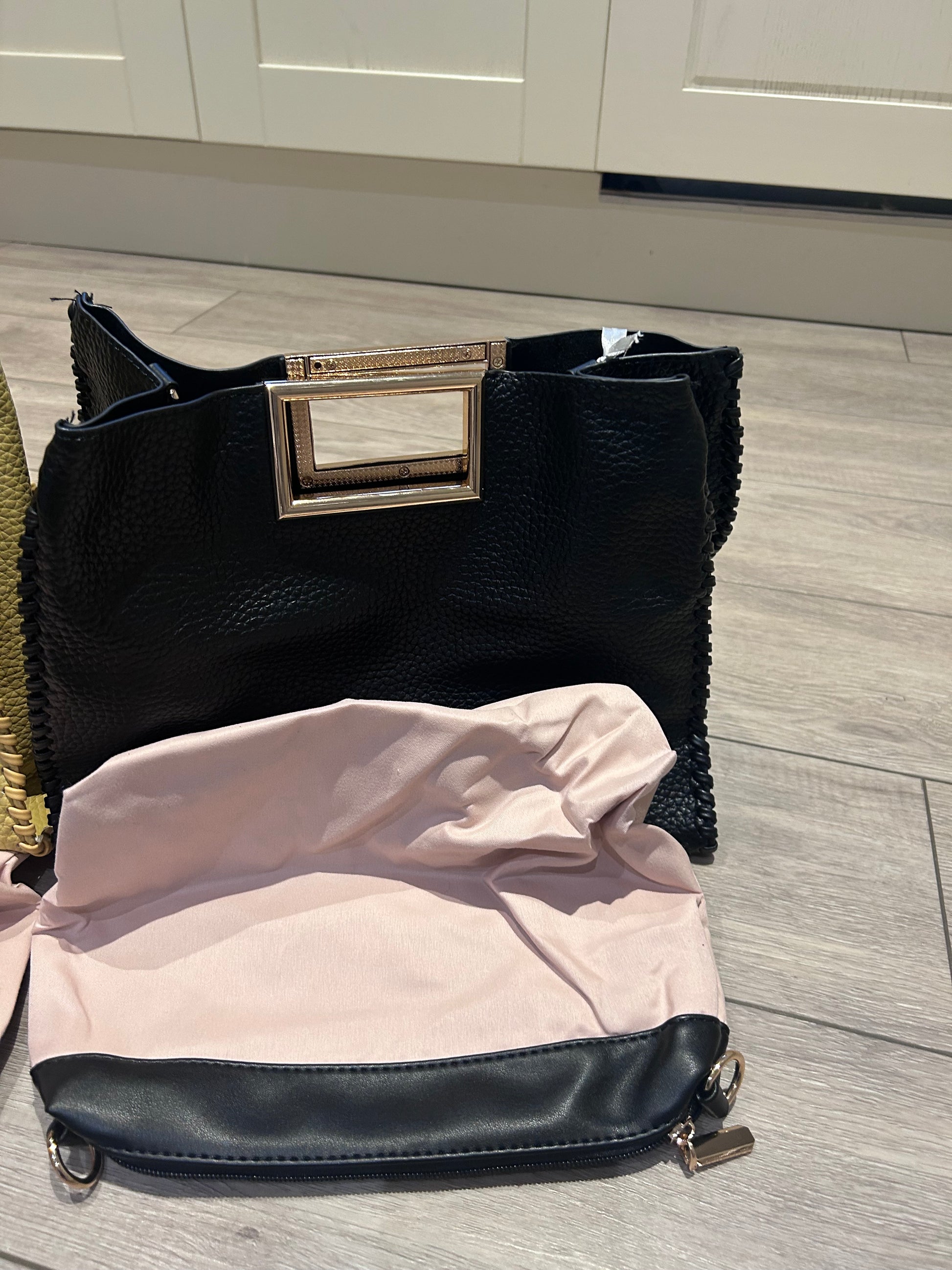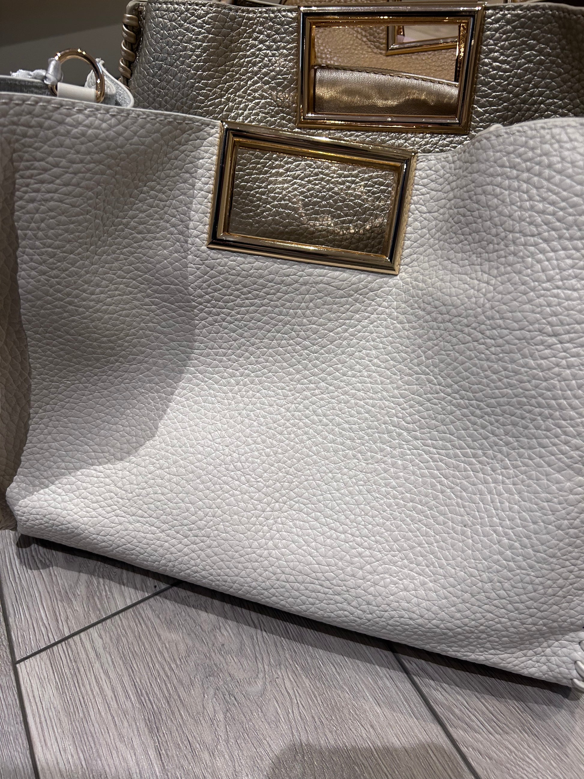 Gold square magnetic close handles.