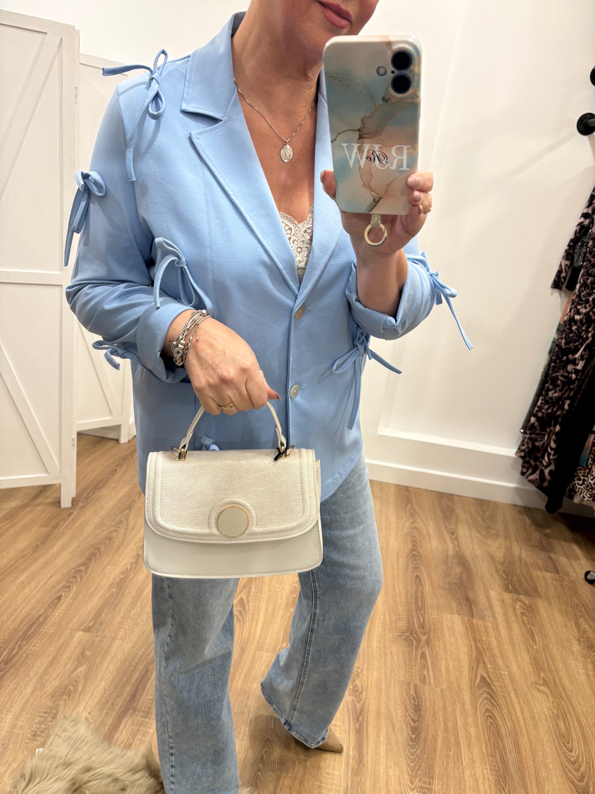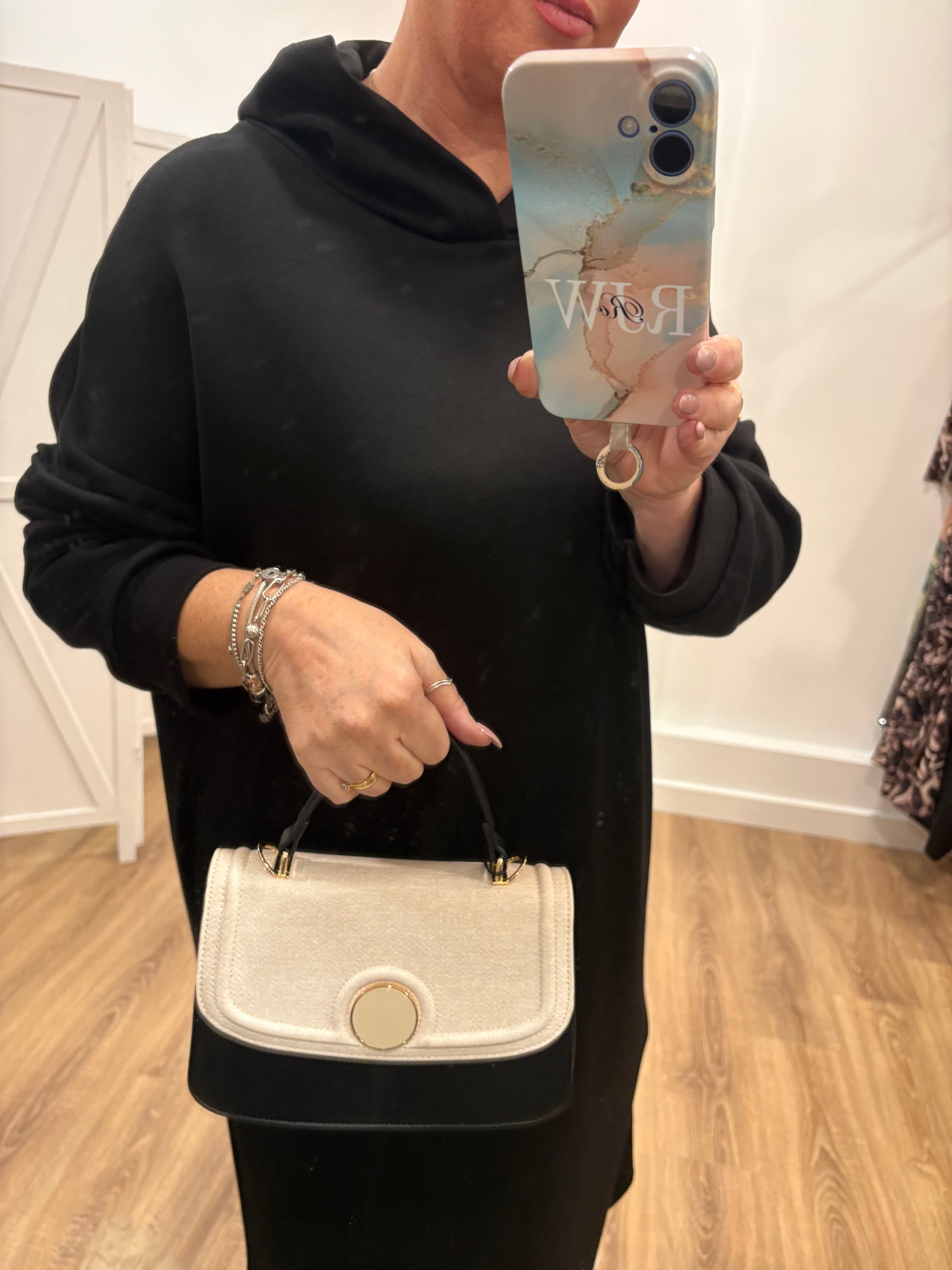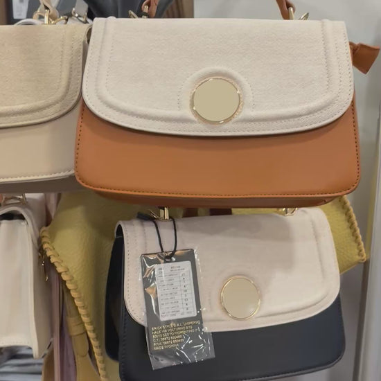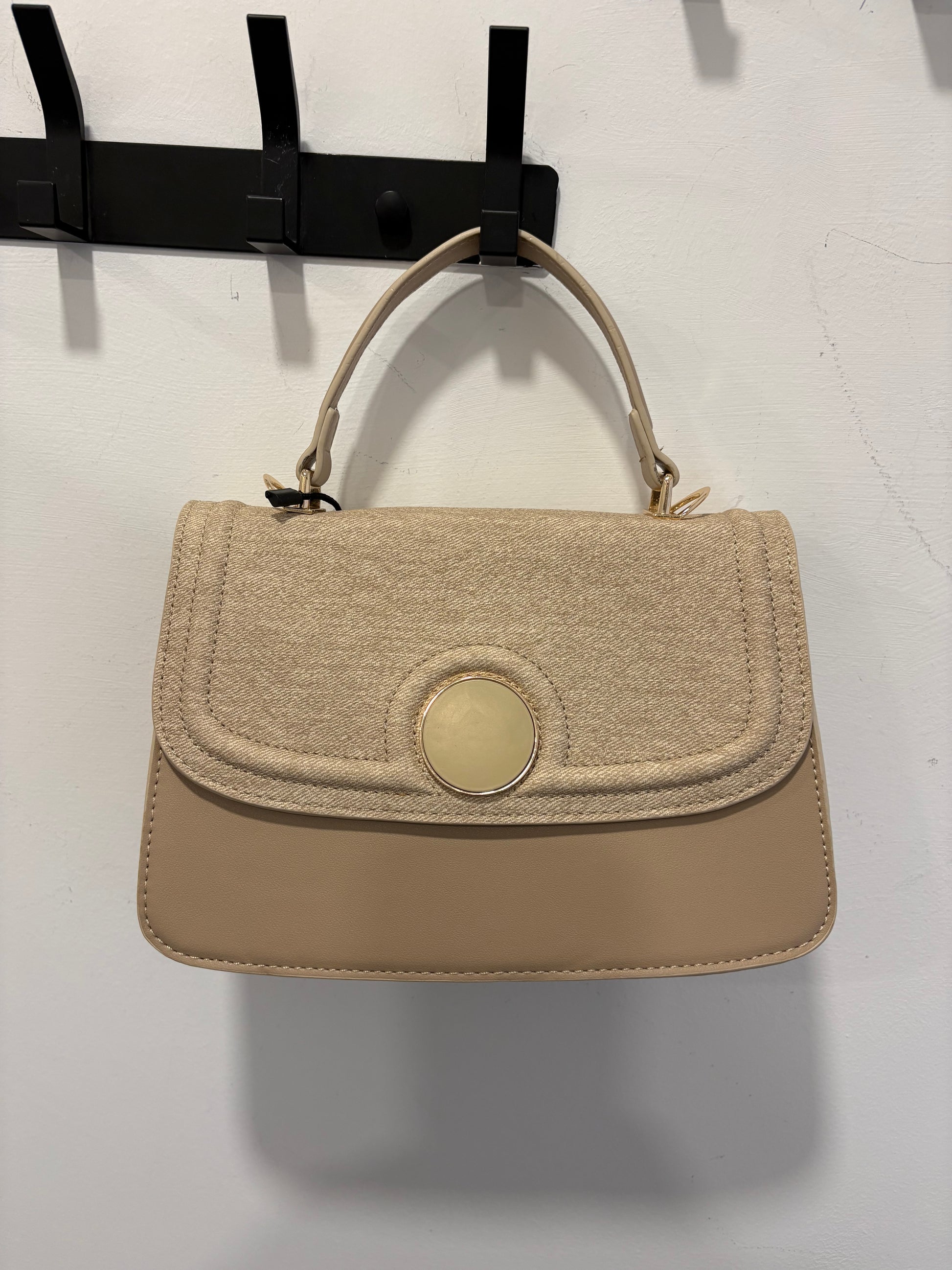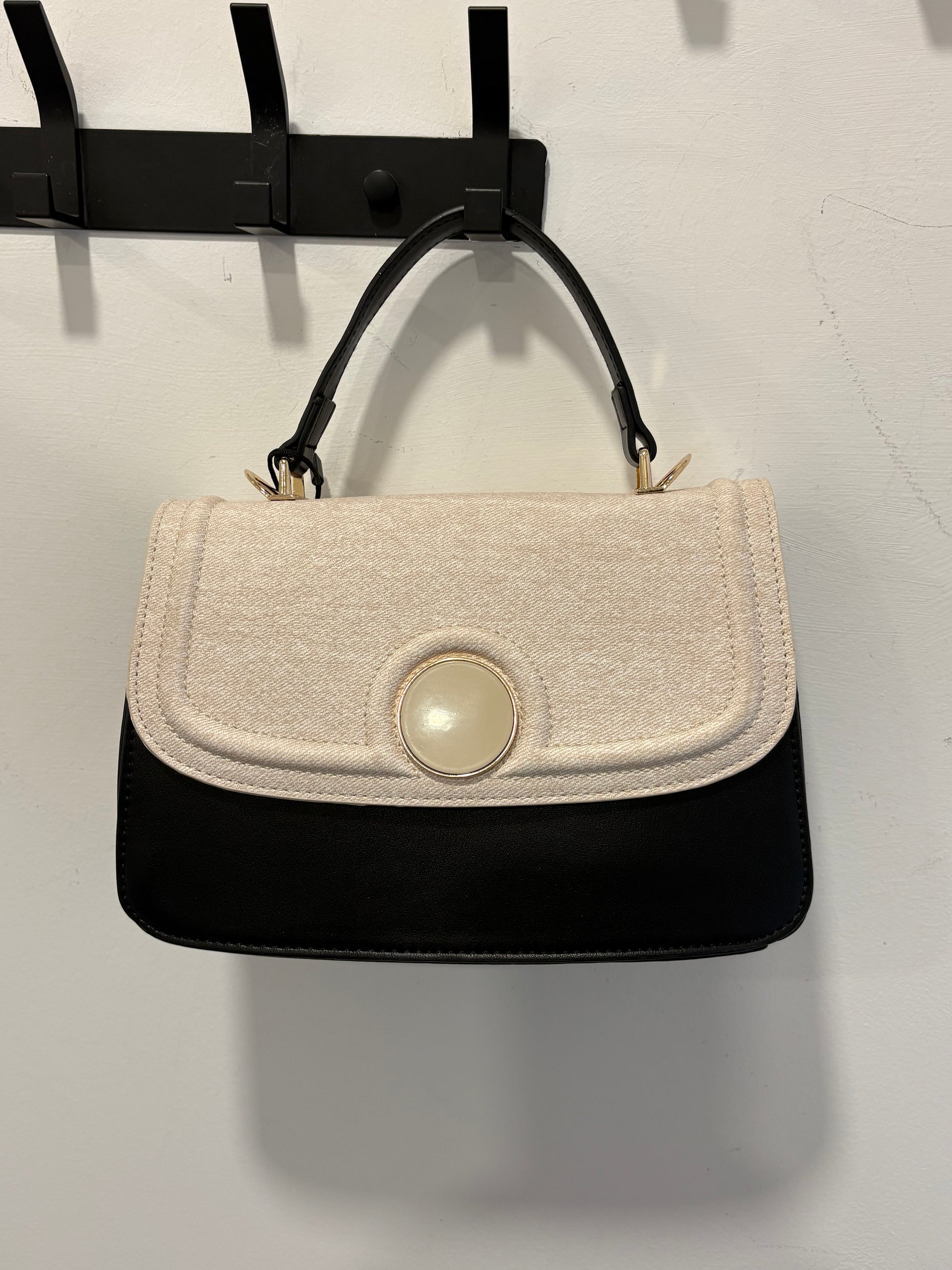 Leather look with fabric top section and pearly circle detail to the front with a gold edge.