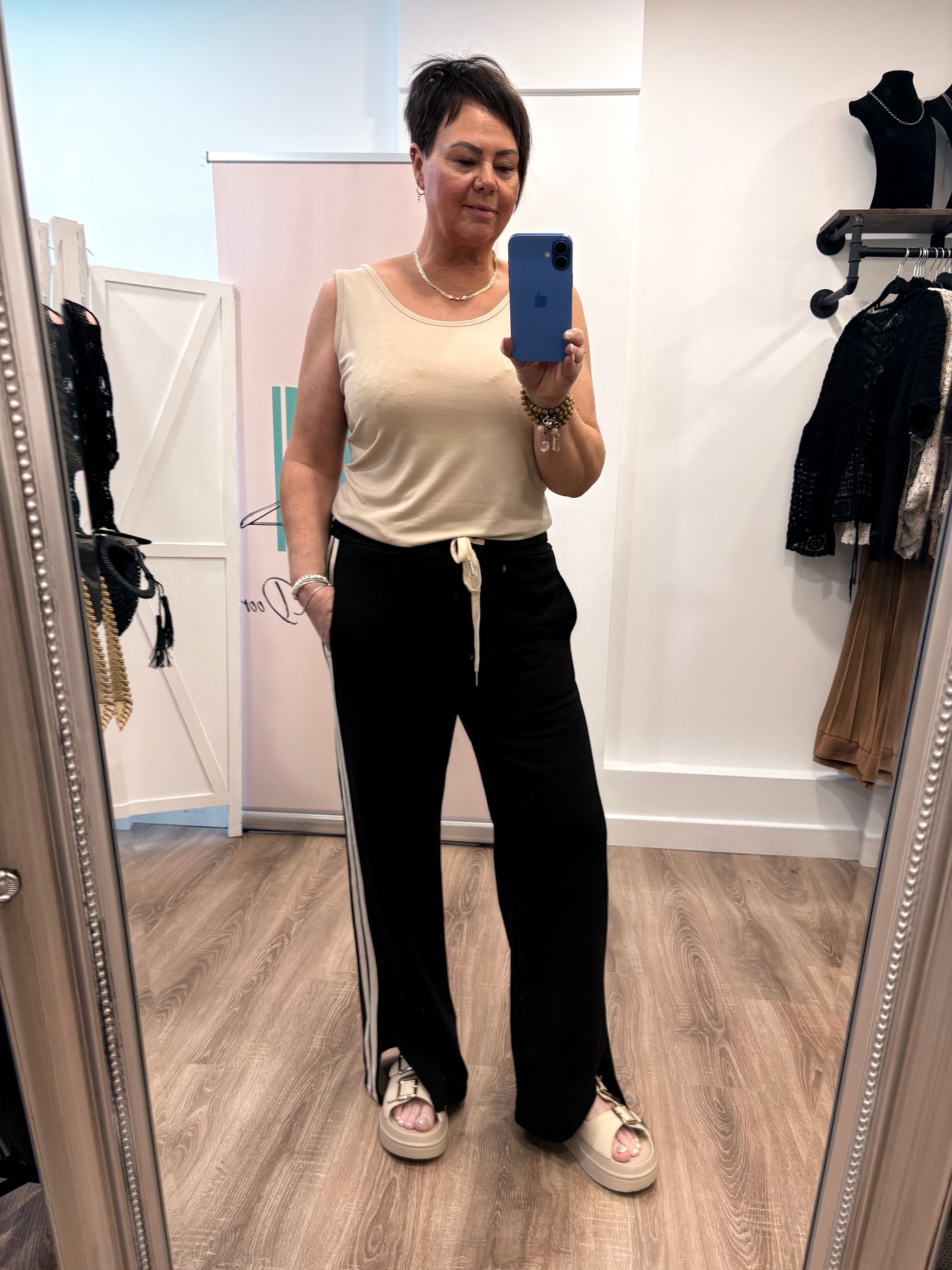 Joggers are wide leg and slits to the sides.