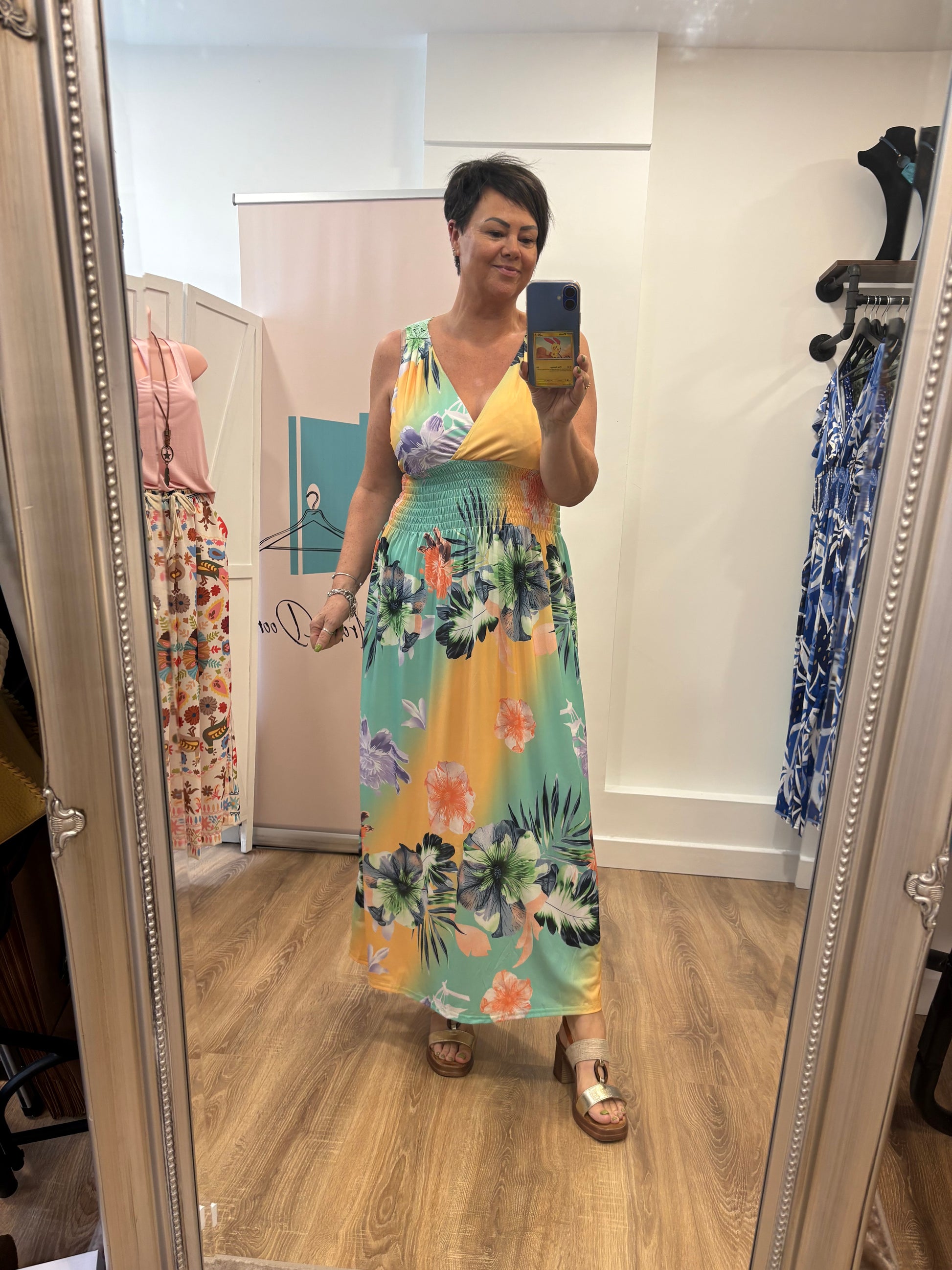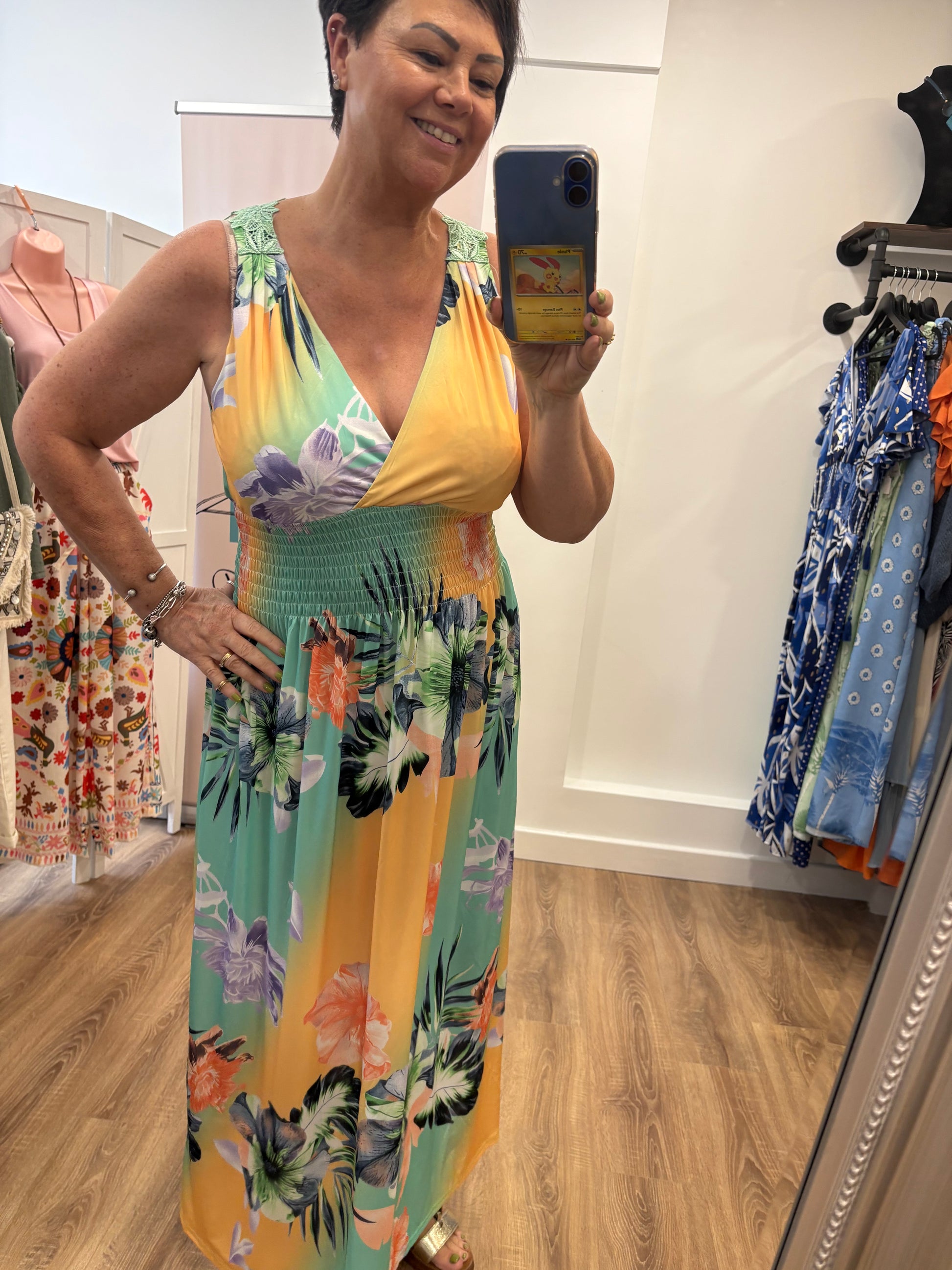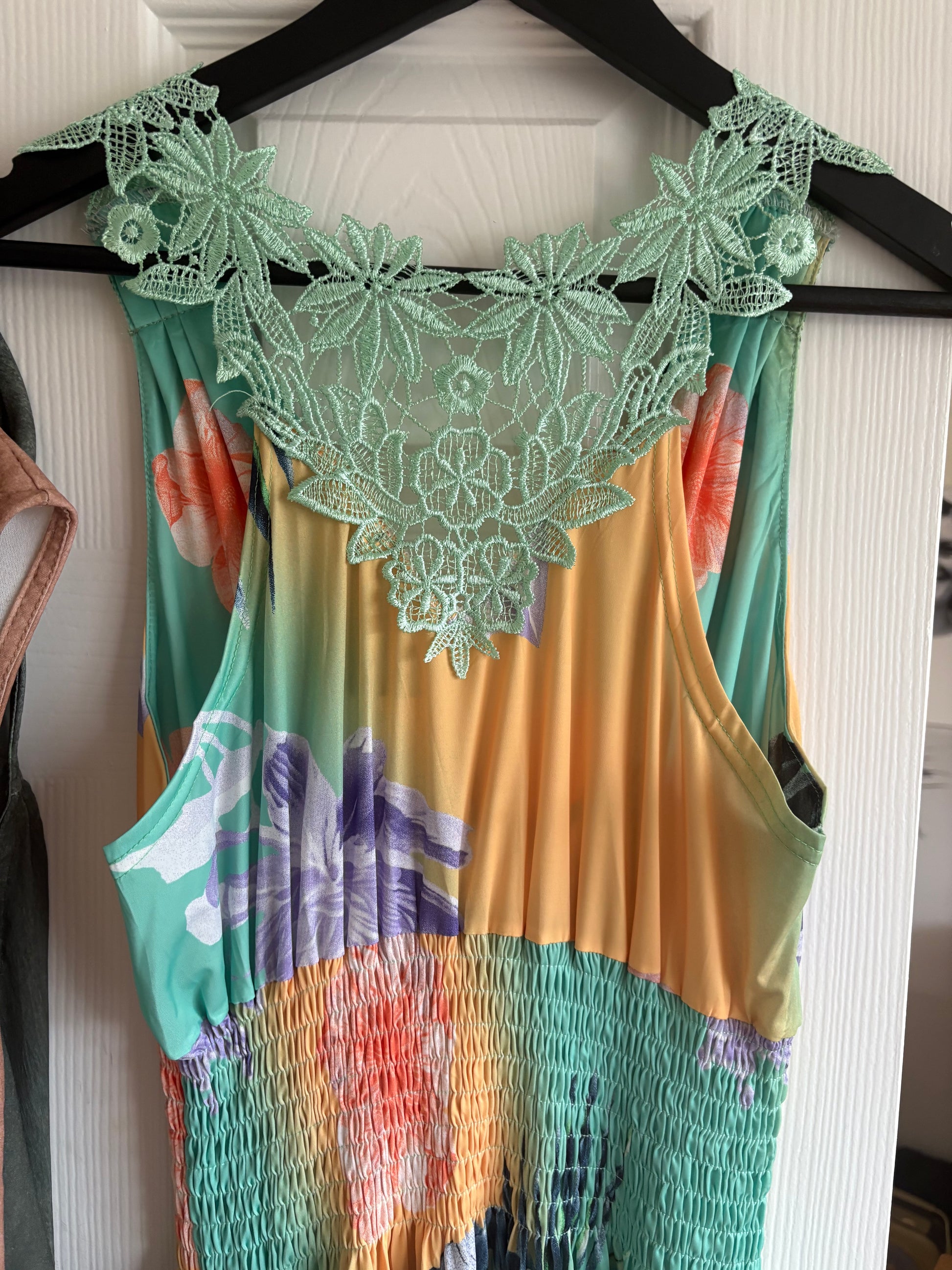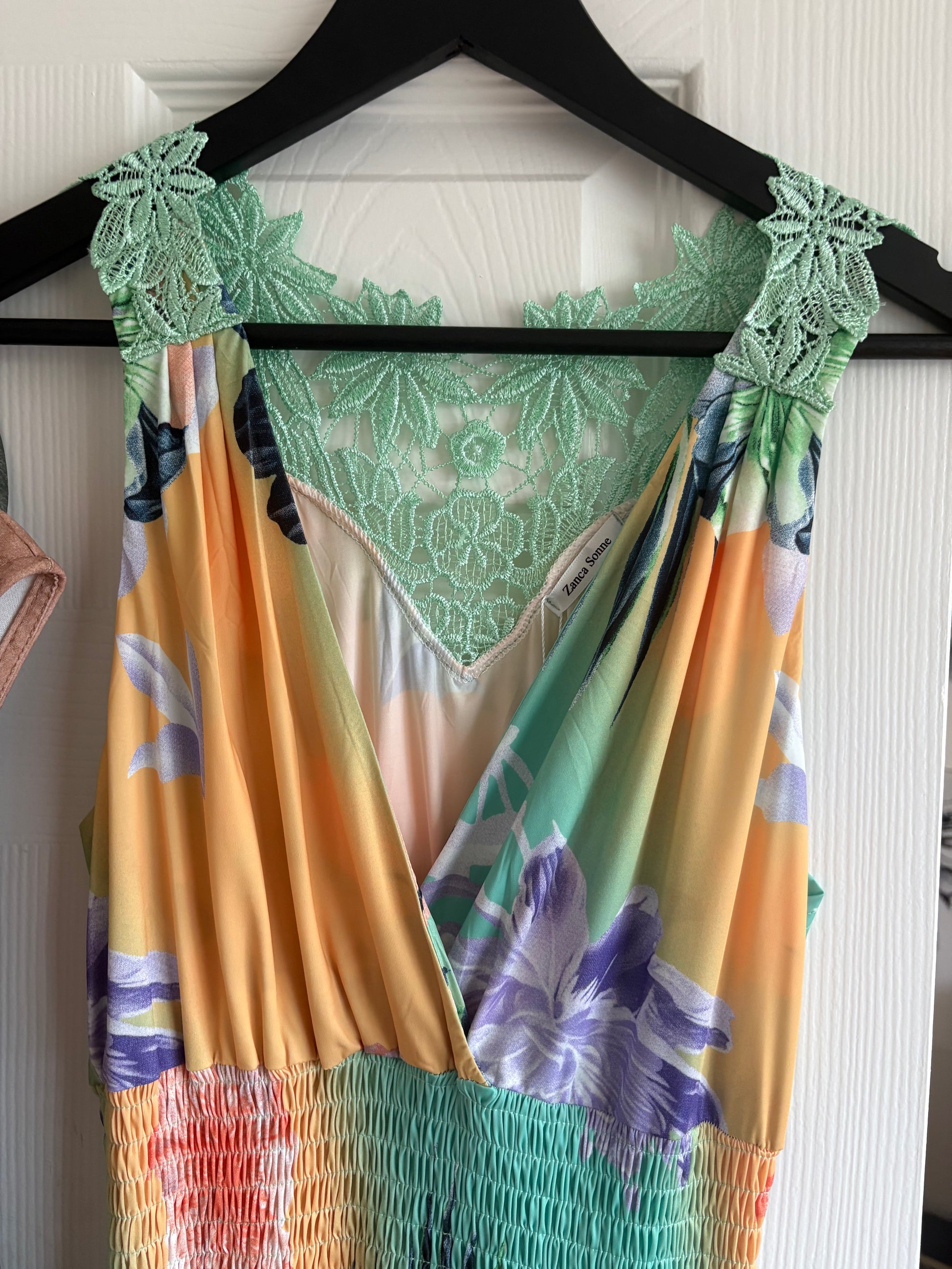 Sleeveless, wrap front with thick crochet lace to the shoulders and the back.